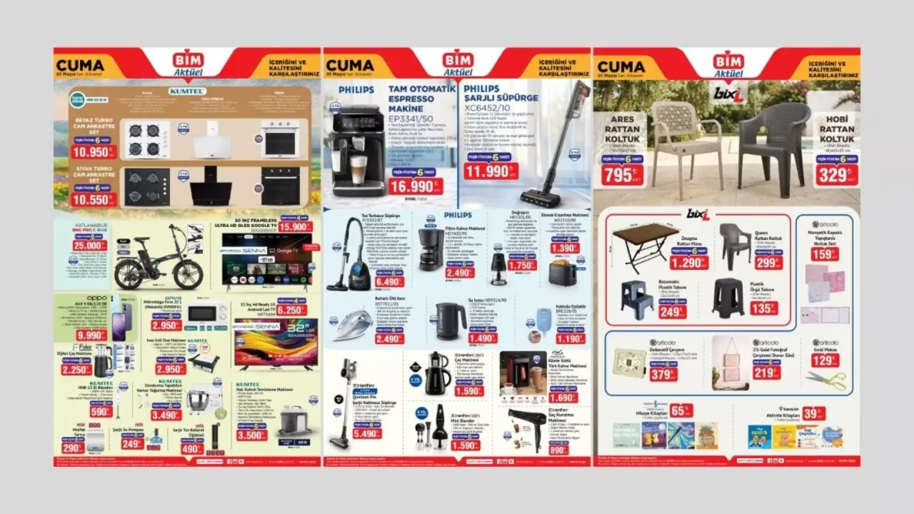 Türkiye genelinde milyonlarca tüketicinin yakından takip ettiği BİM aktüel ürünler kataloğu yayınlandı. 1 Mayıs 2026 tarihinden itibaren geçerli olacak kampanyada, teknoloji ürünlerinden mutfak gereçlerine kadar birçok dikkat çekici fırsat yer alıyor.