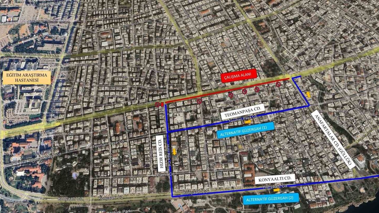 Büyükşehir Belediyesi Fen İşleri Dairesi Başkanlığı'nın 100. Yıl Bulvarı'nda bir süreden beri sürdürdüğü asfalt çalışması etaplar halinde devam ediyor. Çalışma kapsamında 100. Yıl Bulvarı'nın Konyaaltı istikametinden şehir merkezi yönüne gidiş bölümünde, Hızır Reis Caddesi ile Anafartalar Caddesi (Güllük Kavşağı) arasında kalan yaklaşık 730 metrelik bölümde asfalt çalışması yapılacak. Çalışma kapsamında bu güzergâh 8 Mart Pazar günü saat 07.00 itibarıyla araç trafiğine kapatılacak. Yoğun bir çalışma programı uygulanarak yolun 9 Mart Pazartesi günü sabah saat 06.00'da yeniden trafiğe açılması planlanıyor. Sürücülerin çalışma süresince alternatif güzergâhları tercih etmeleri istendi.