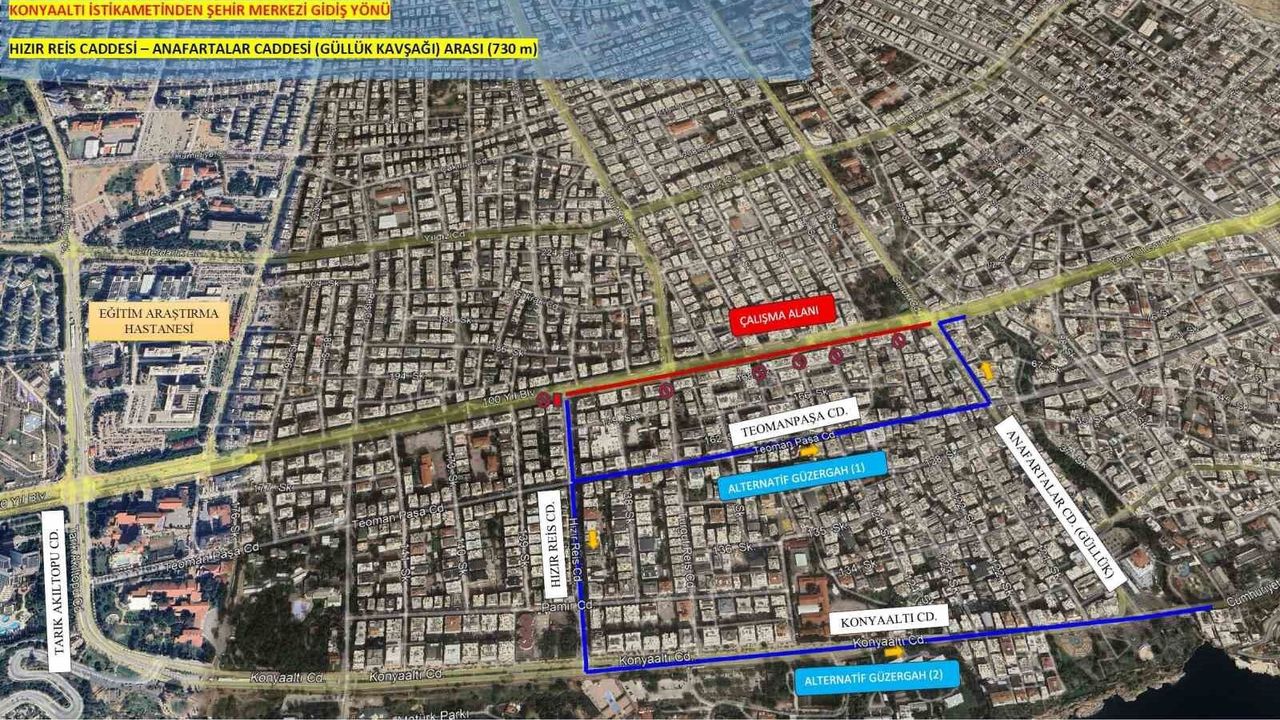 Büyükşehir Belediyesi Fen İşleri Dairesi Başkanlığı'nın 100. Yıl Bulvarı üzerinde etaplar halinde sürdürdüğü asfalt çalışması devam ediyor. Çalışma kapsamında 100. Yıl Bulvarı'nın Konyaaltı istikametinden şehir merkezi yönüne gidiş bölümünde, Hızır Reis Caddesi ile Anafartalar Caddesi (Güllük Kavşağı) arasında kalan yaklaşık 730 metrelik bölümde asfalt çalışması yapılacak. Çalışma kapsamında bu güzergah 12 Nisan Pazar sabahı saat 07.00 itibariyle araç trafiğine kapatılacak. Yoğun bir çalışma programı uygulanarak yolun 13 Nisan Pazartesi günü sabah saat 06.00'da yeniden trafiğe açılması planlanıyor. Sürücülerin çalışma süresince alternatif güzergâhları tercih etmeleri istendi.