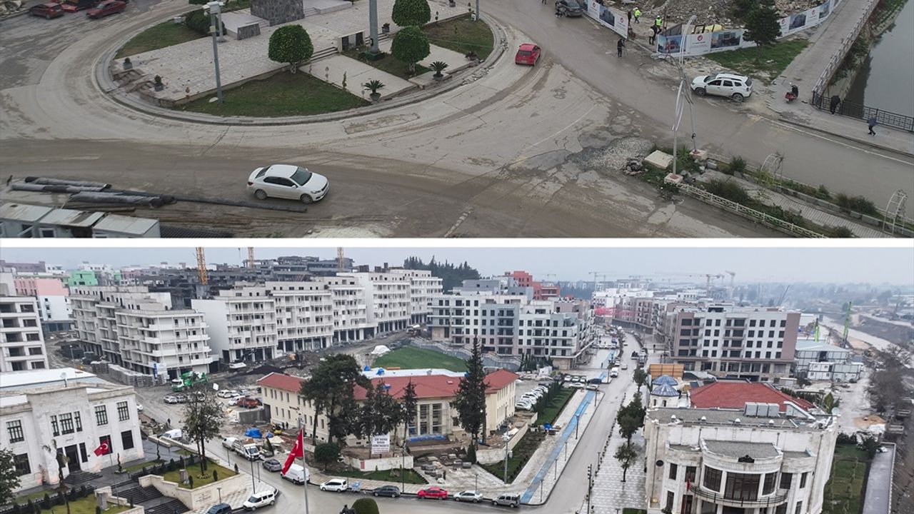 Hatay'da 6 Şubat 2023'te meydana gelen depremlerdeki yıkımın fotoğraf ve videoları ile afetin üçüncü yılında aynı açıyla havadan kayda alınan görsellerin birleşimi, şehirde inşa çalışmalarında gelinen noktayı ortaya koydu.