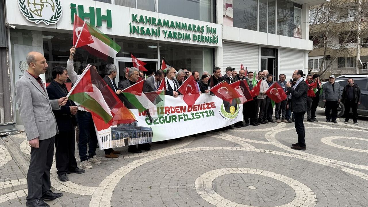 Merkez Onikişubat ilçesi Karamanlı Mahallesi'nde bulunan İnsan Hak ve Hürriyetleri (İHH) İnsani Yardım Derneği Kahramanmaraş Şubesi önünde bir araya gelen Kahramanmaraş Platformu üyeleri, ellerinde Türk ve Filistin bayraklarıyla 'Nehirden denize özgür Filistin' yazılı pankart açtı.