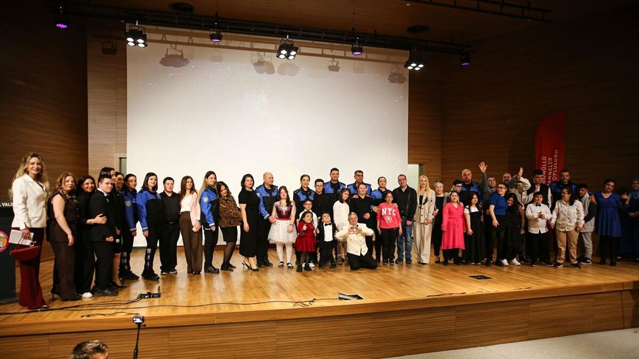 Etkinlikte anneleriyle sahneye çıkan down sendromlu bireyler şarkı söyledi.