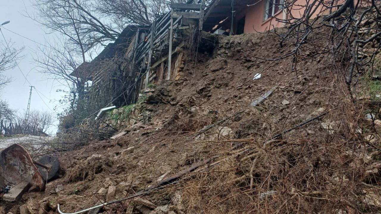 Velicanlı Mahallesi'nde bulunan tek katlı müstakil bir evin istinat duvarı yağışların etkisiyle yıkıldı.