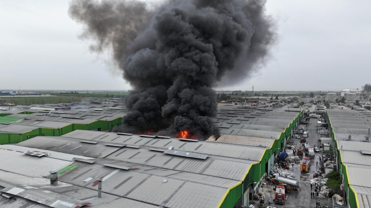 Adana'nın merkez Seyhan ilçesinde geri dönüşüm tesisinde çıkan yangına müdahale ediliyor.