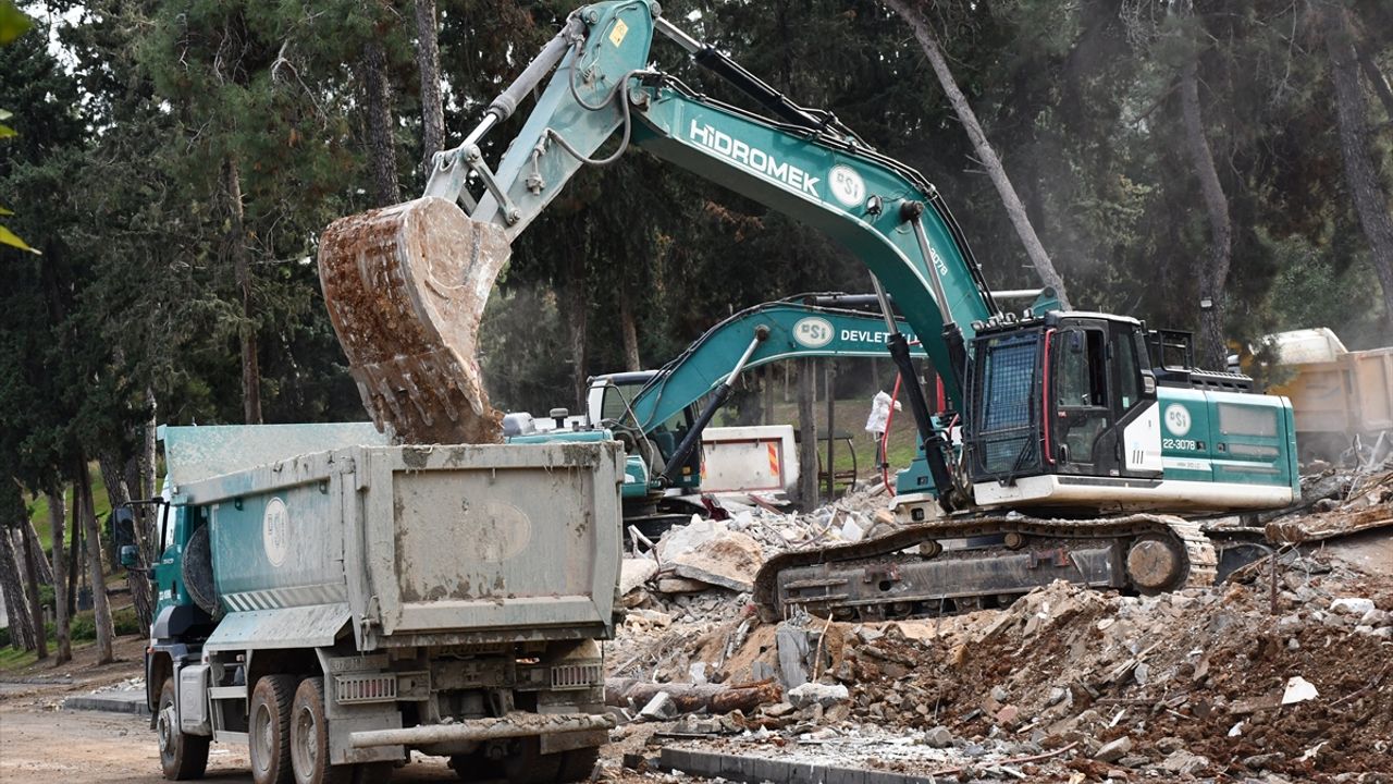 Devlet Su İşleri ve Büyükşehir Belediyesi ekiplerince iş makineleriyle yıkılan yapıların kalıntıları, kamyonlarla bölgeden uzaklaştırılıyor.