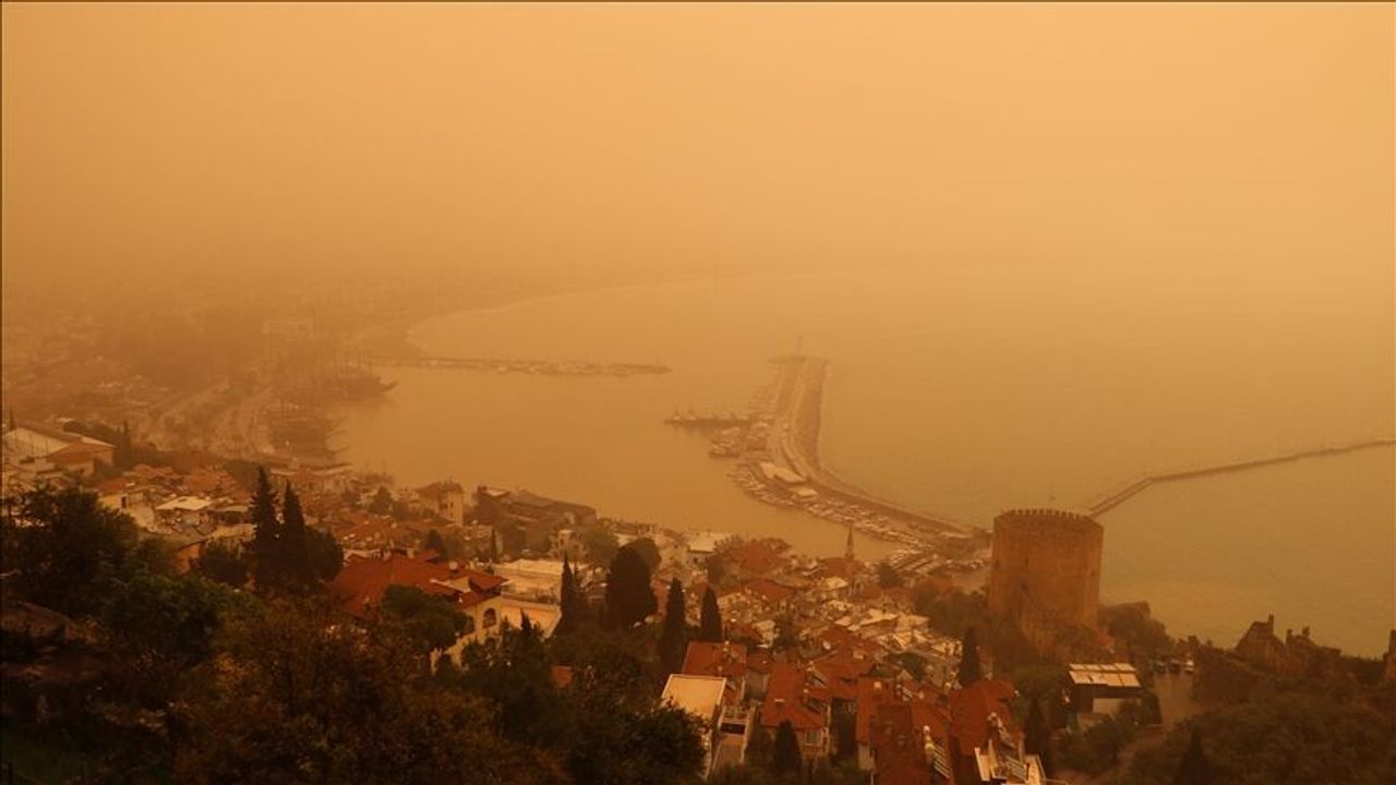 Antalya'nın Alanya ilçesinde gökyüzü Afrika'dan gelen çöl tozu nedeniyle turuncuya büründü.