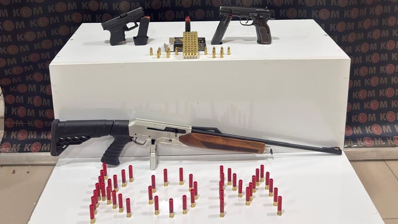 Afşin ilçesinde belirlenen adreste yapılan aramada, ruhsatsız 2 tabanca ile 1 yivsiz tüfek, 2 şarjör ve 105 fişek ele geçirildi.