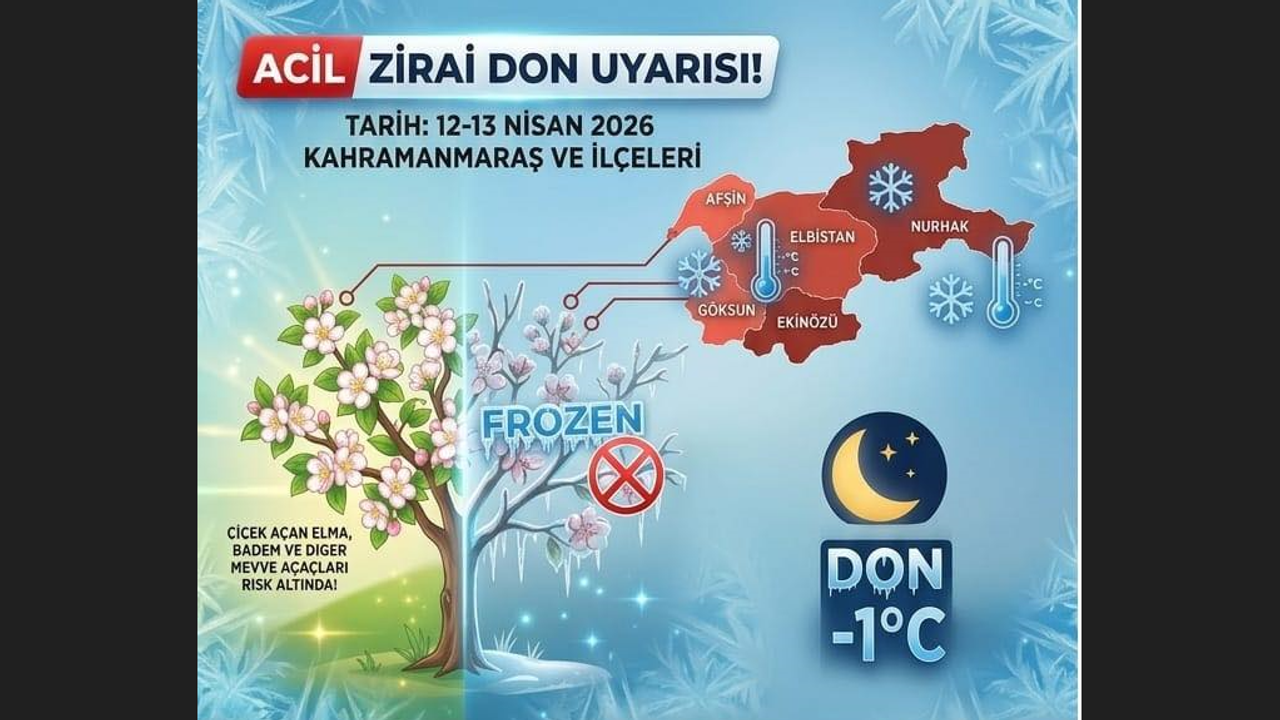 Afşin İlçe Tarım ve Orman Müdürlüğü, hava sıcaklıklarının düşmesiyle birlikte çiftçilere zirai don uyarısında bulundu. Yapılan açıklamada, özellikle 12-13 Nisan gecelerinde Afşin, Elbistan, Göksun, Nurhak ve Ekinözü ilçelerinde sıcaklıkların -1 ile -2 dereceye kadar düşmesinin beklendiği belirtildi.