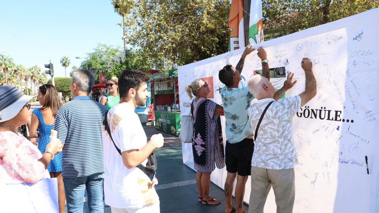 Alanya Alaaddin Keykubat Üniversitesi (ALKÜ) tarafından Anıt Meydanı’na konulan "Özgür Filistin, Özgür Gazze için Gönülden Gönüle" imza platformu, vatandaşlar ve turistler tarafından imzalarla dolduruldu.