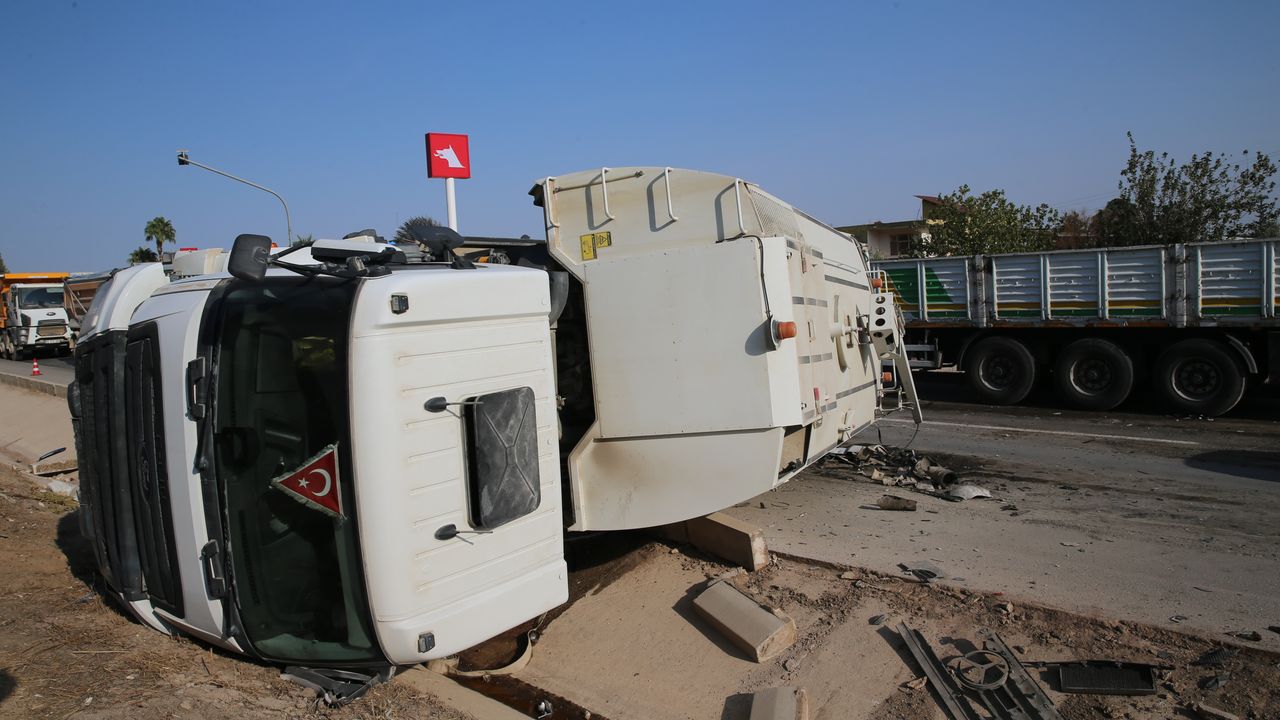 Hatay'ın merkez Antakya ilçesinde tırla çarpışan yol temizleme aracı devrildi.