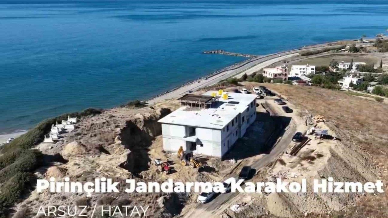 Hatay’ın Arsuz ilçesine inşa edilen Pirinçlik Jandarma Karakol Komutanlığı binasında inşa çalışmaları sürüyor.