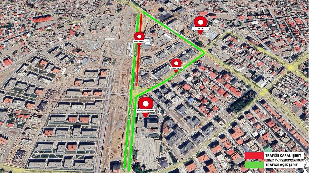 Kahramanmaraş Büyükşehir Belediyesi, Azerbaycan Bulvarı’nda yürütülen kalıcı konut ve iş yerlerinin inşası ve çevre düzenleme çalışmaları dolayısıyla geçici bir trafik düzenlemesine gidileceğini duyurdu. Büyükşehir Belediyesi tarafından yapılan açıklamada, çalışmaların güvenli ve hızlı bir şekilde tamamlanabilmesi amacıyla Azerbaycan Bulvarı üzerinde Büyükşehir Belediyesi ana hizmet binasından Kıbrıs Meydanı’na gidiş istikametinin, 22 Aralık 2025 – 20 Ocak 2026 tarihleri arasında 20.00 ile 07.00 saatleri arasında araç trafiğine kapalı olacağı bildirildi. Düzenlemenin yalnızca gece saatlerini kapsadığı, gündüz saatlerinde trafik akışının normal seyrinde devam edeceği belirtildi.