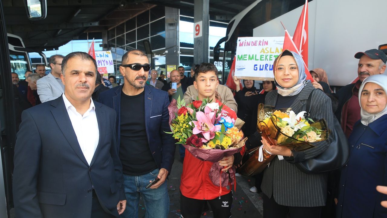 Kahramanmaraş Şehirlerarası Otobüs Terminali'nde Türk bayrakları, meşaleler ve davul zurna eşliğinde ailesi, arkadaşları ve Gençlik ve Spor İl Müdürlüğü personeli tarafından çiçeklerle karşılanan milli güreşçi, tebrikleri kabul edip fotoğraf çektirdi.