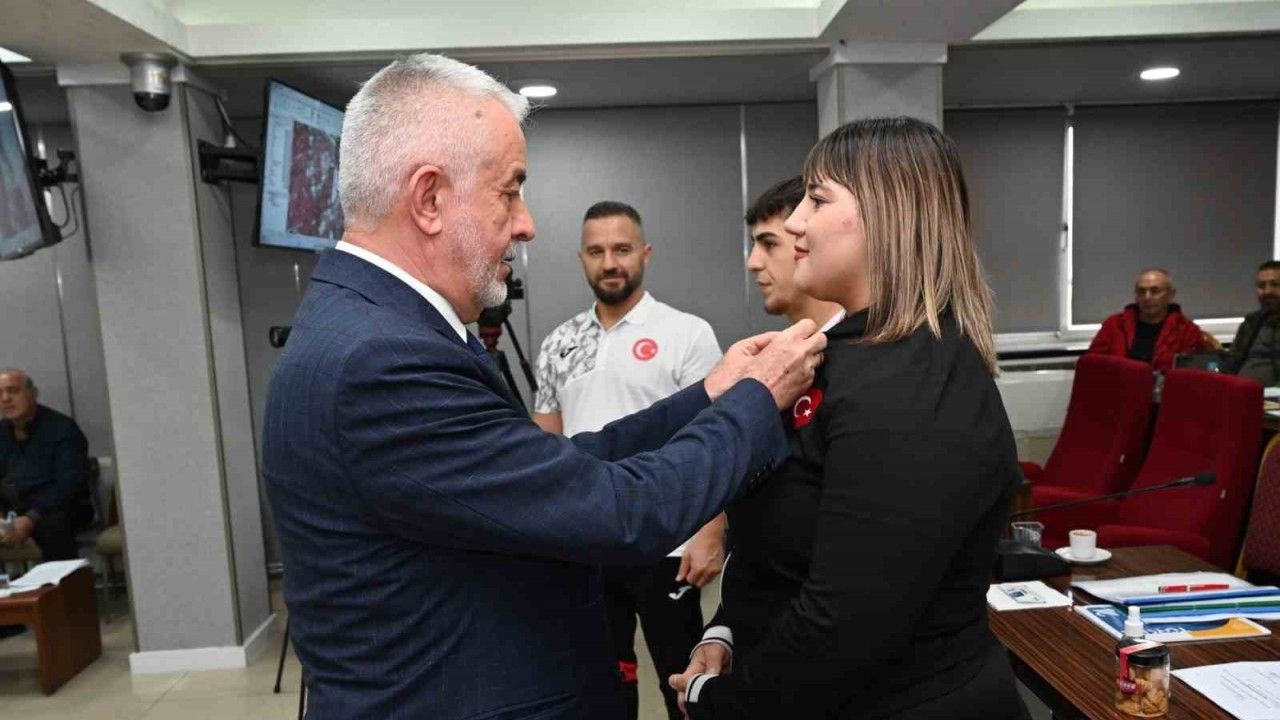 Milli sporcular Fatmagül Çevik ve Mustafa Erdoğan ile antrenör Ferit Şen, Isparta Belediye Meclisi’nin kasım ayı toplantısına misafir oldu. Belediye Başkanı Şükrü Başdeğirmen, toplantı öncesinde milli sporcular Fatmagül Çevik ve Mustafa Erdoğan ile antrenör Ferit Şen’i altınla ödüllendirdi.