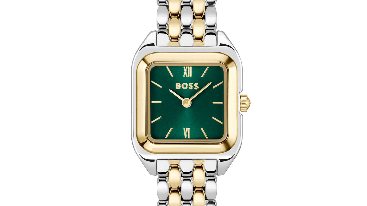 Çift renkli kasa ve bilezik tasarımıyla öne çıkan Boss saat modeli, yeşil kadranı ve altın vurgularıyla modern bir şıklık sunarak bileğe sofistike bir dokunuş kazandırıyor. 22 mm çapındaki zarif dikdörtgen kasası, ince ve feminen bir duruş sağlarken; yeşil kadrandaki detaylar saatin özgün karakterini ön plana çıkarıyor.