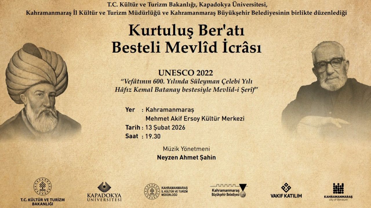 Kahramanmaraş Büyükşehir Belediyesi, 106 yıl önce eşsiz direnişiyle Anadolu’da bağımsızlık meşalesini ateşleyen şehrin kutsal mücadelesini kültürel alanlarda da yaşatmaya devam ediyor. Bu kapsamda; Kültür ve Turizm Bakanlığı desteğiyle, Kahramanmaraş Büyükşehir Belediyesi, Kapadokya Üniversitesi ve İl Kültür Turizm Müdürlüğü iş birliğinde “Kurtuluş Ber’atı Besteli Mevlîd İcrâsı” programı düzenlenecek. 13 Şubat Cuma günü Mehmet Akif Ersoy Kültür Merkezi’nde saat 19.30’da başlayacak olan programda Süleyman Çelebi’nin İslam dünyasında büyük bir manevi değer taşıyan Vesîletü’n-Necât adlı eserinin, Hâfız Kemal Batanay tarafından 1956 yılında yapılan bestesinden seçme bölümler icra edilecek. Etkinlik, Kahramanmaraş’ın kurtuluş ruhunu sanat ve musiki aracılığıyla yeniden yaşatmayı hedeflerken, aynı zamanda kültürel mirasın gelecek nesillere aktarılmasına da katkı sağlayacak. Şehrin tarihi kimliğini ve manevi değerlerini yaşatmak açısından büyük önem taşıyan etkinliğe tüm vatandaşlar davet edildi.