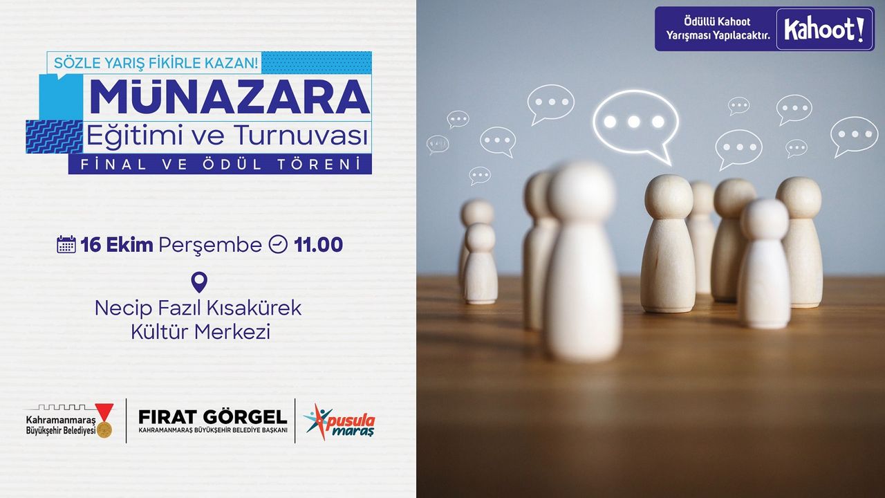 Gençlere yönelik projeleriyle adından söz ettiren Kahramanmaraş Büyükşehir Belediyesinin gençlerin kişisel gelişimine katkı sunması için hayata geçirdiği “Münazara Eğitimi ve Turnuvası” final aşamasına geldi. Lise öğrencilerinden oluşan 70 takımla başlayan organizasyonda 4 takım finale kaldı. 16 Ekim Perşembe günü Necip Fazıl Kısakürek Kültür Merkezi’nde jüri karşısına çıkacak olan 4 takım, argümanlarını savunarak kıyasıya rekabet edecek. Saat 11.00’da başlayacak heyecan verici finali tüm vatandaşlar takip edebilecek. Ayrıca turnuvayı izlemeye gelen vatandaşlar arasında da Kahoot bilgi yarışması yapılarak organizasyona eğlence katılacak. Büyükşehir Belediyesinden yapılan açıklamada, tüm vatandaşların programı takip etmeye davetli olduğu belirtildi.