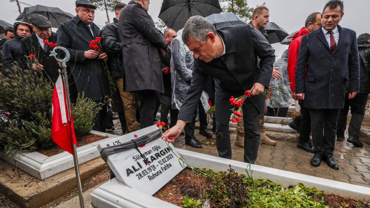 Depremlerde ölenlerin yakınlarına başsağlığı dileyen Özel, kabirlere karanfil bırakarak dua okudu.