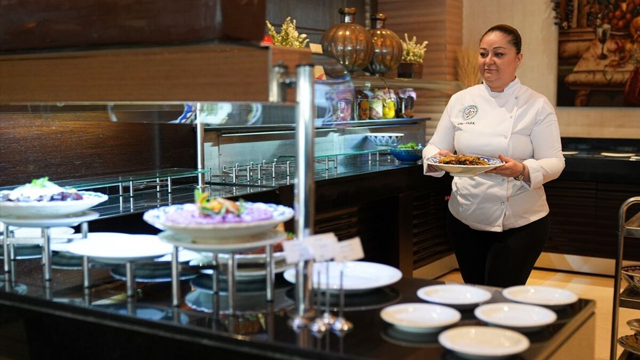 Kahramanmaraş merkezli 6 Şubat 2023'te meydana gelen depremlerden etkilenen Hatay'da iş yeri yıkılan şef Gökçe Eker, İzmir'deki bir otelde yöresel lezzetleri iftar menüsünde müşterilere sunuyor.