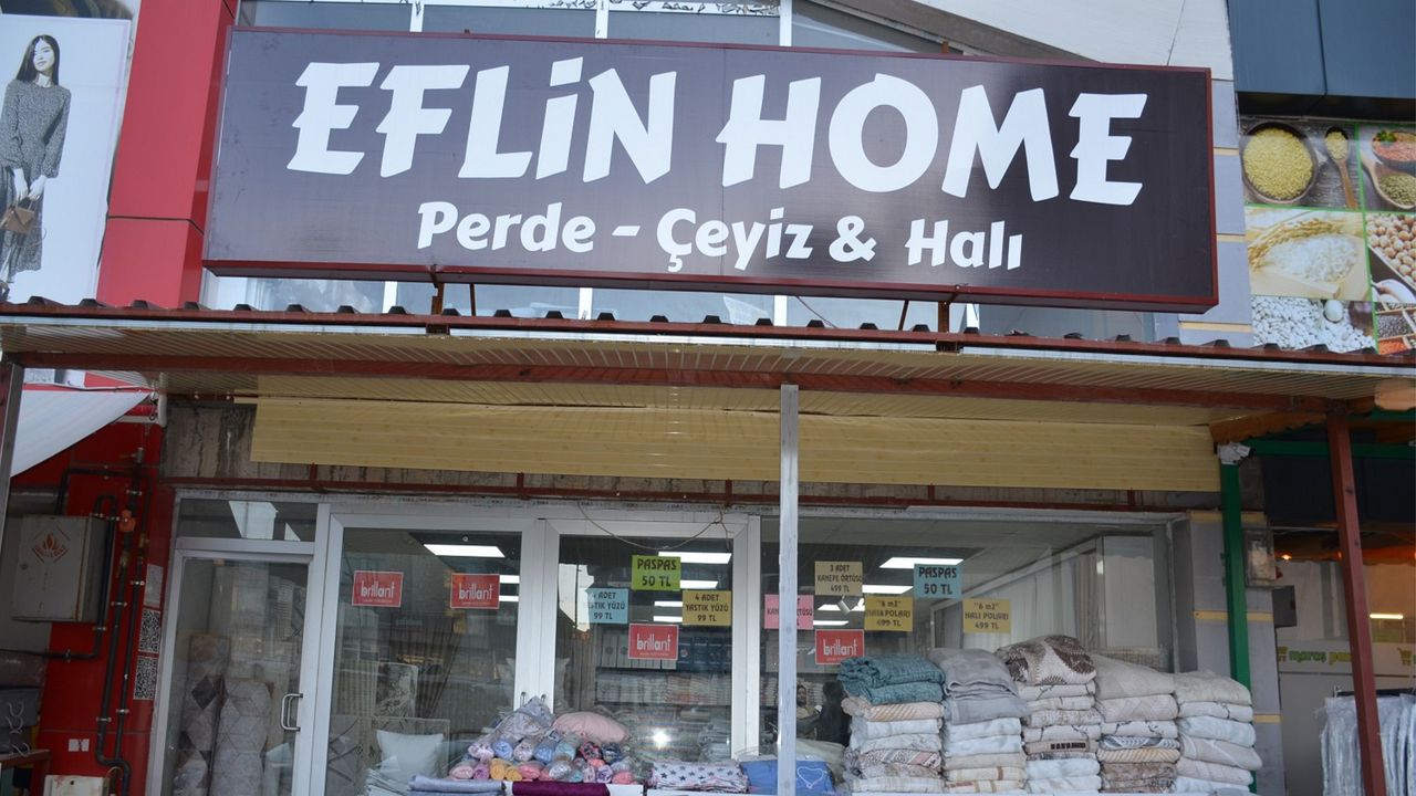 GO Petrol arkası, Maraş Pazarı yanında faaliyet gösteren Eflin Home; perde, çeyiz ve halı ürünlerinde geniş ürün yelpazesi ve uygun fiyatlarıyla dikkat çekiyor.