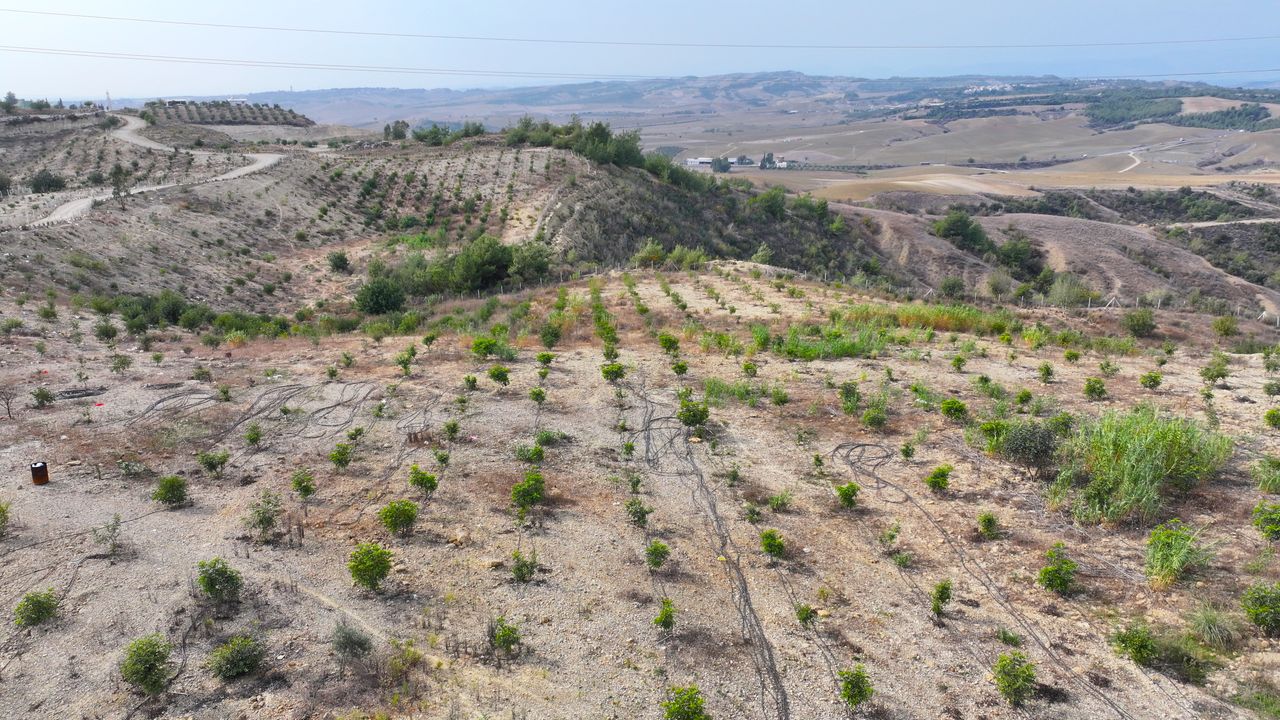 Su kuyusu açıp güneş enerjisiyle çalışan damla sulama sistemi kuran Kasapoğlu, gübreleme ve bakım çalışmalarıyla araziyi yeniden yeşertti.