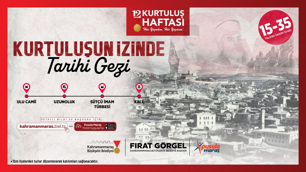 Kahramanmaraş Büyükşehir Belediyesi, gençlere yönelik destek ve etkinliklerini aralıksız sürdürüyor. Gençlerin tarih bilincini güçlendirmek ve şehrin milli mücadelesini yerinde anlatmak amacıyla Pusula Maraş çatısı altında hayata geçirilen programlara bir yenisi daha ekleniyor. Şehrin düşman işgalinden kurtuluşunun 106. yıl dönümü dolayısıyla Büyükşehir Belediyesi tarafından, 11 ilçeden gençlerin katılımıyla “Kurtuluşun İzinde” temalı özel bir gezi programı düzenlenecek. 12 Şubat Kurtuluş Haftası kapsamında gerçekleştirilecek etkinlikte, gençler Kahramanmaraş’ın kurtuluş destanına ev sahipliği yapan tarihi mekânları yerinde görme fırsatı bulacak. 15 – 35 yaş aralığındaki gençlerin katılım sağlayabileceği programda; Ulu Camii, Uzunoluk, Sütçü İmam Türbesi ve Kahramanmaraş Kalesi ziyaret edilecek. Gezi boyunca, şehrin kurtuluş mücadelesinde önemli rol oynayan bu tarihi noktalar hakkında kapsamlı bilgiler aktarılacak. Tarihçi yazar Şevki Karabekiroğlu’nun rehberliğinde gerçekleştirilecek gezide gençler, Kahramanmaraş’ın bağımsızlık mücadelesini, olayların yaşandığı mekânlarda dinleyerek tarihi daha yakından tanıma imkânı elde edecek. Geziye Onikişubat ve Dulkadiroğlu dışındaki ilçelerden katılacak gençlerin ulaşımı ise Büyükşehir Belediyesi tarafından sağlanacak. Tarihi geziye başvurular https://kahramanmaras.bel.tr/duyuru/2026/01/15/kurtulusun-izinde-tarihi-gezi-programi-basvuru-formu internet adresi üzerinden yapılabiliyor.