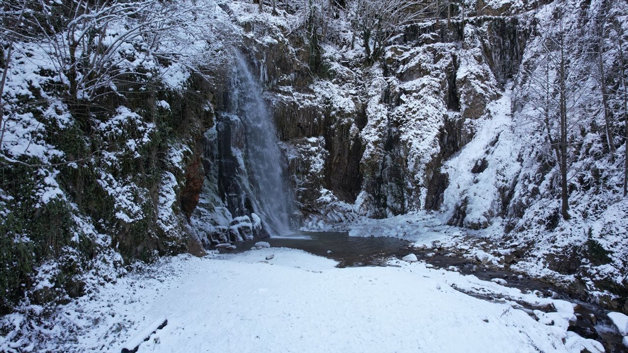 Gümüşhane'de Örümcek Ormanları'nın içinden doğup 15 metreden dökülen Çağlayandibi Şelalesi, karın ardından beyaz örtüyle kaplandı.