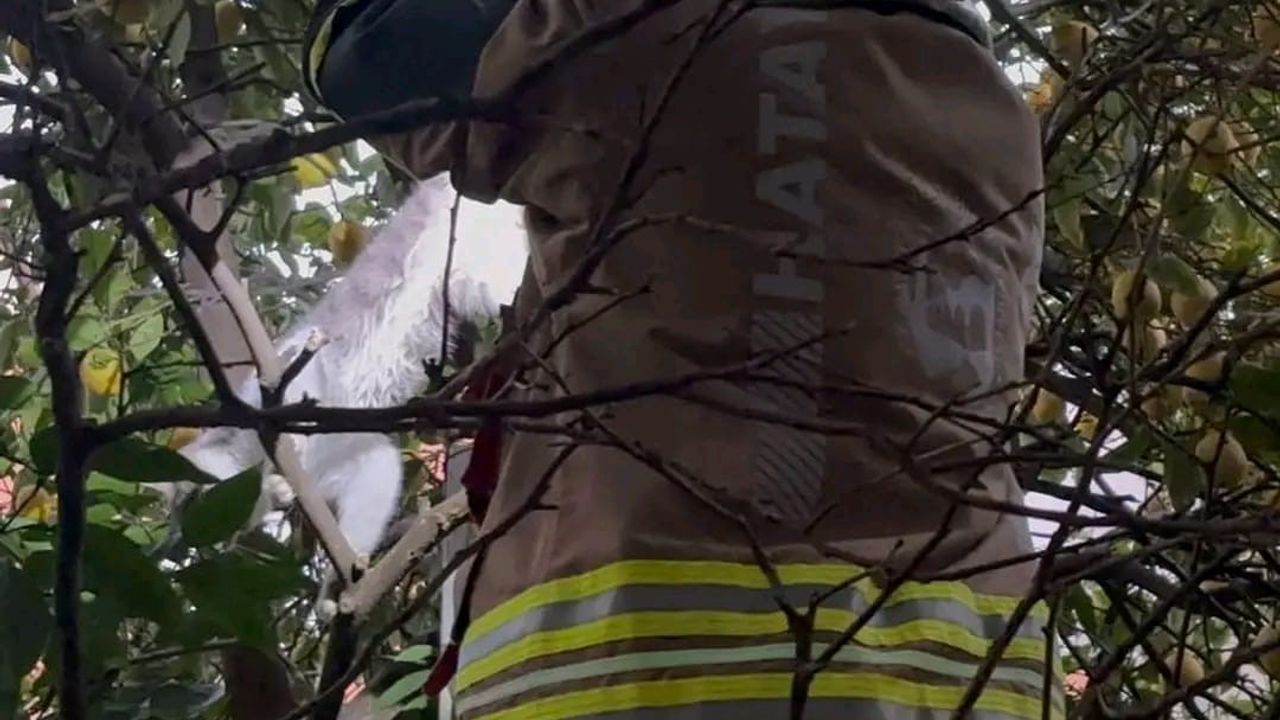 Hatay'ın İskenderun ilçesinde ağacın dallarına ayağı takılan kedi, itfaiye ekiplerince kurtarıldı.