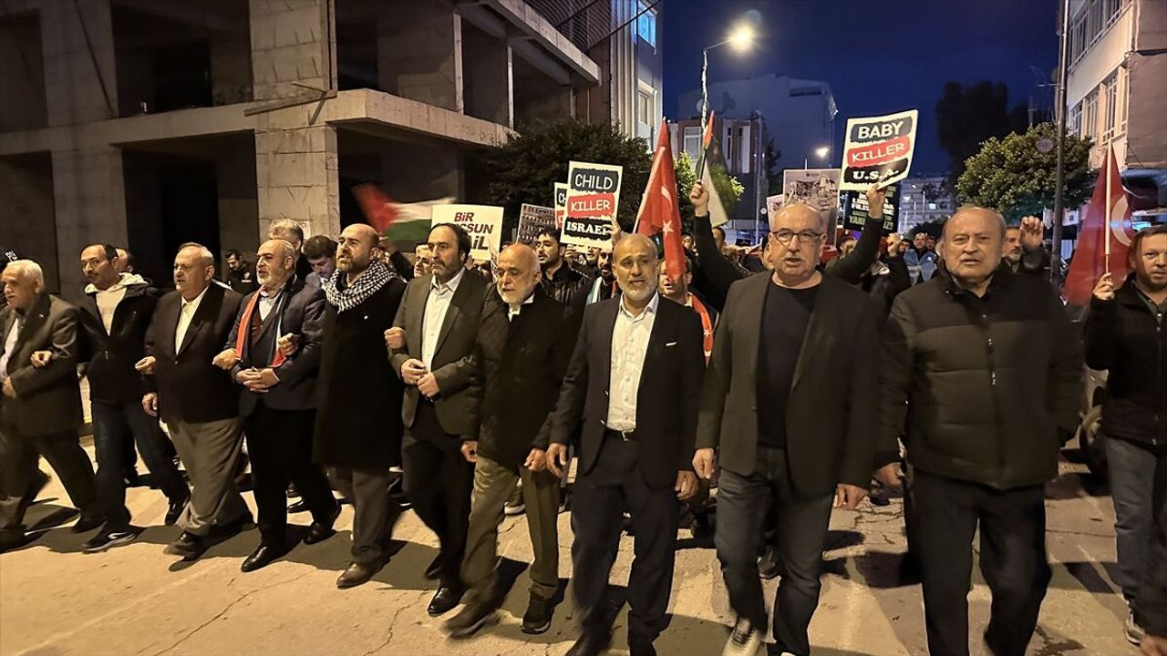 Türk ve Filistin bayrakları ile dövizler taşıyan grup, İsrail aleyhine sloganlar atarak Kaptan Mehmet Paşa Camisine kadar yürüdü.