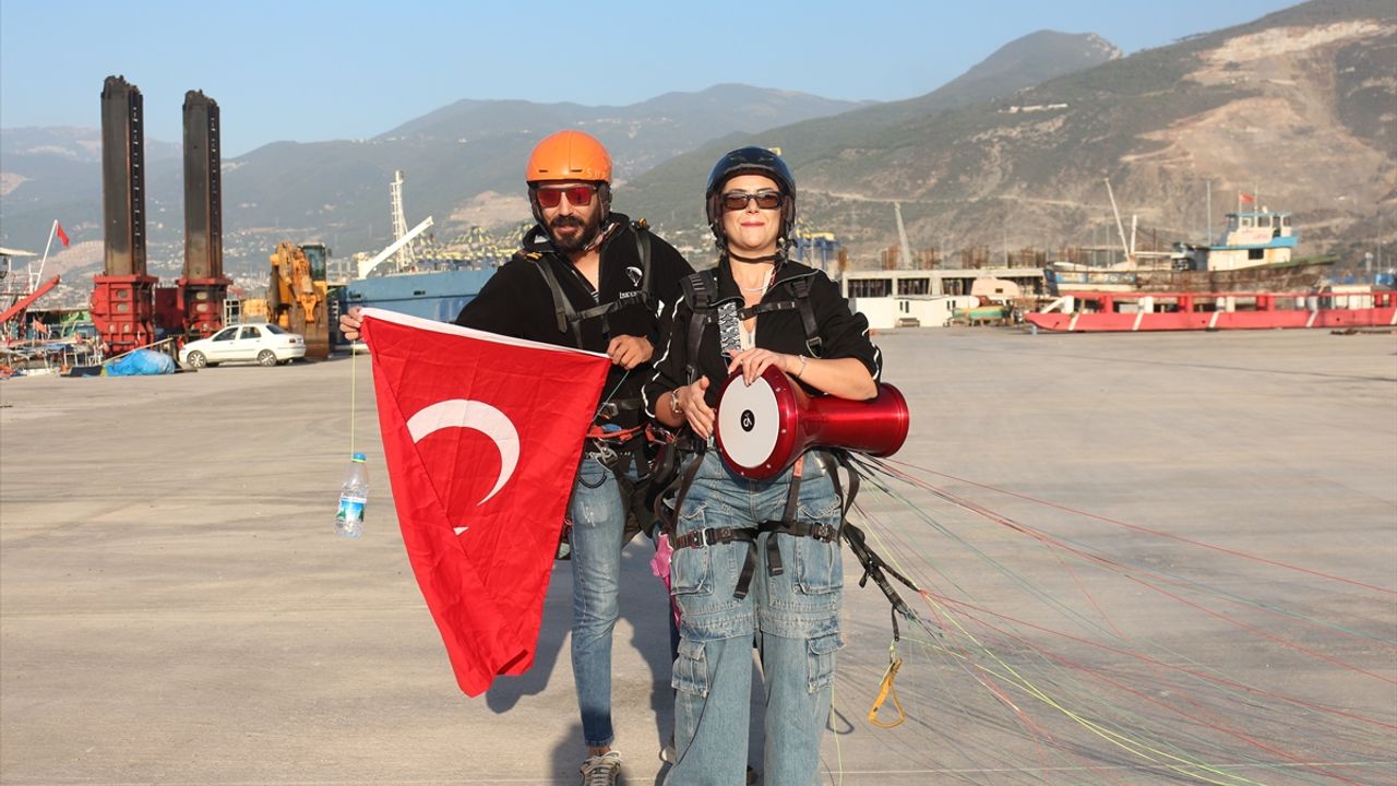 Amanos Dağları'ndaki kalkış alanına giden paraşüt pilotu İlker Özgüven ile Seda Arslan darbukayla yamaçtan havalanarak paraşütle tandem uçuşu gerçekleştirdi.