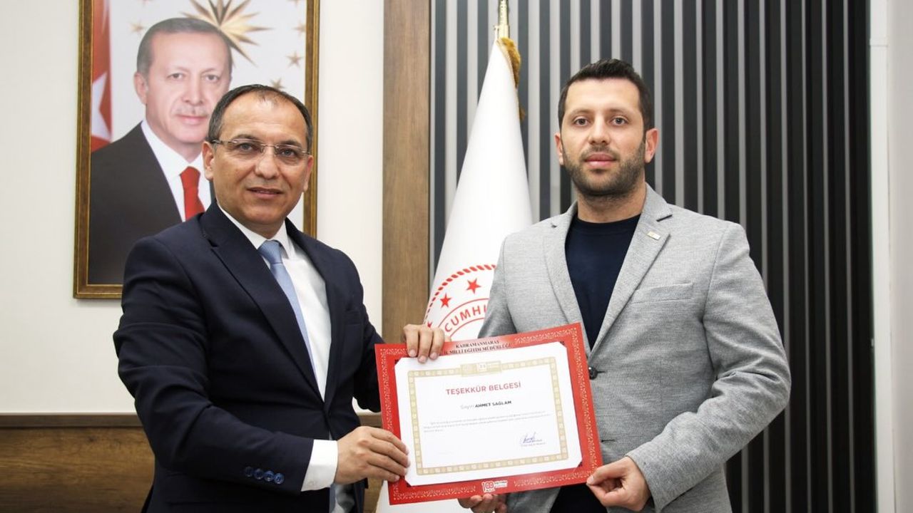 Kahramanmaraş İl Millî Eğitim Müdürü Erhan Baydur, Kahramanmaraş Türk Kızılayı Toplumsal Hizmet Merkezi Müdürü Ahmet Sağlam’a, yürütülen çalışmalara sunduğu katkılardan dolayı teşekkür belgesi takdim etti.
