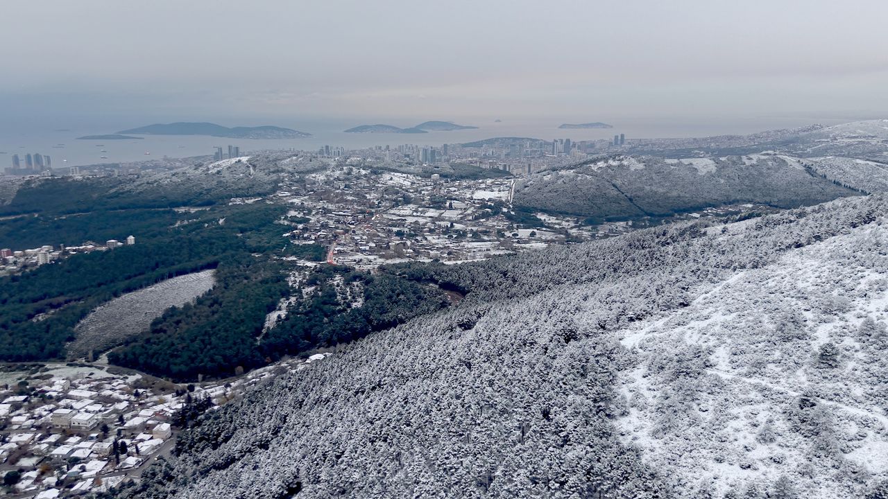 İstanbul'da kar yağışının etkili olduğu Aydos Ormanı, dronla havadan görüntülendi.