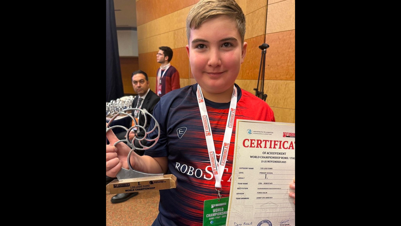 Kahramanmaraşlı Ahmet Efe Akkeçeci, İtalya'nın Roma kentinde düzenlenen Fibonacci Uluslararası Robot Olimpiyatları'nda "1 Kilogram LEGO Sumo" kategorisinde birincilik kazandı.