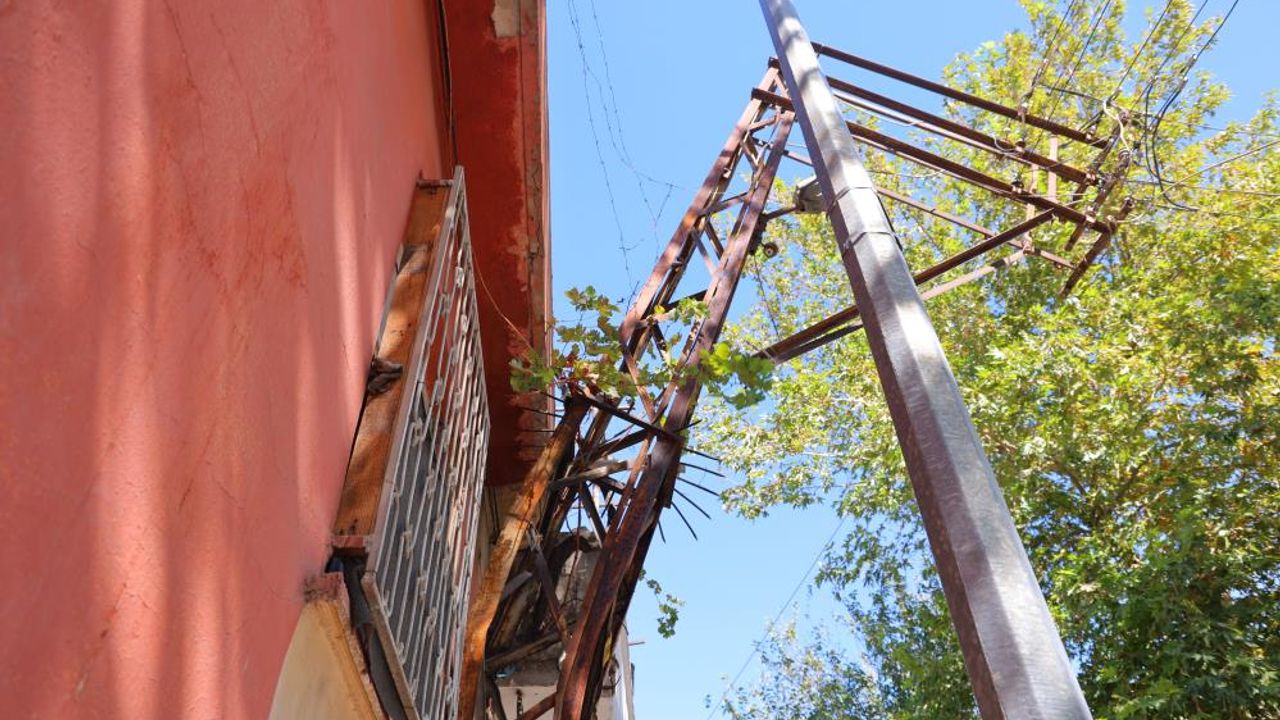 Kahramanmaraş'ta bir kamyonun çarpması sonucu eğik kalan demir elektrik direği aylardır tehlike oluşturuyor.