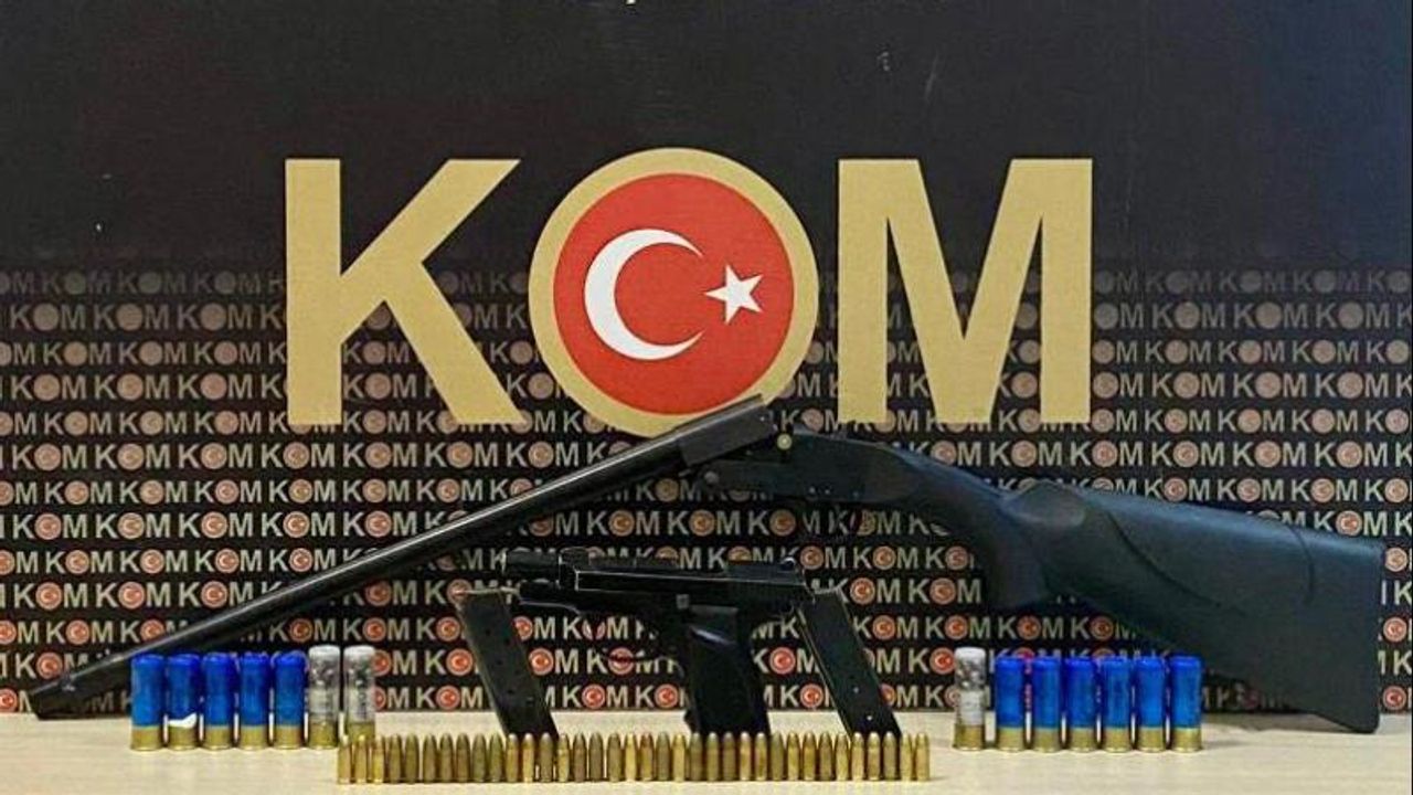 Zanlıların evinde yapılan aramada, 6 ruhsatsız tabanca, 5 pompalı tüfek, 8 şarjör ve 265 fişek ele geçirildi.