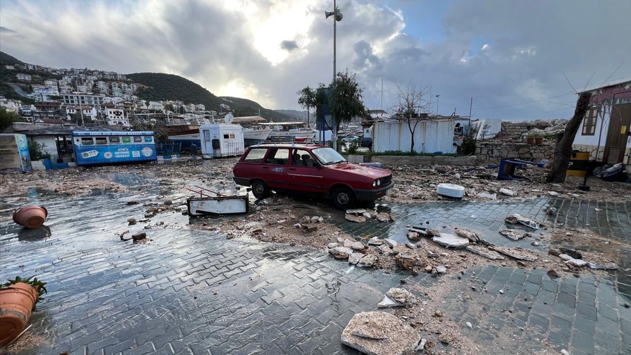 ANTALYA (AA) - Antalya'nın Kaş ilçesinde kuvvetli rüzgar sonrası oluşan dalgalar, limandaki tekne ve işletmelerde hasara neden oldu.