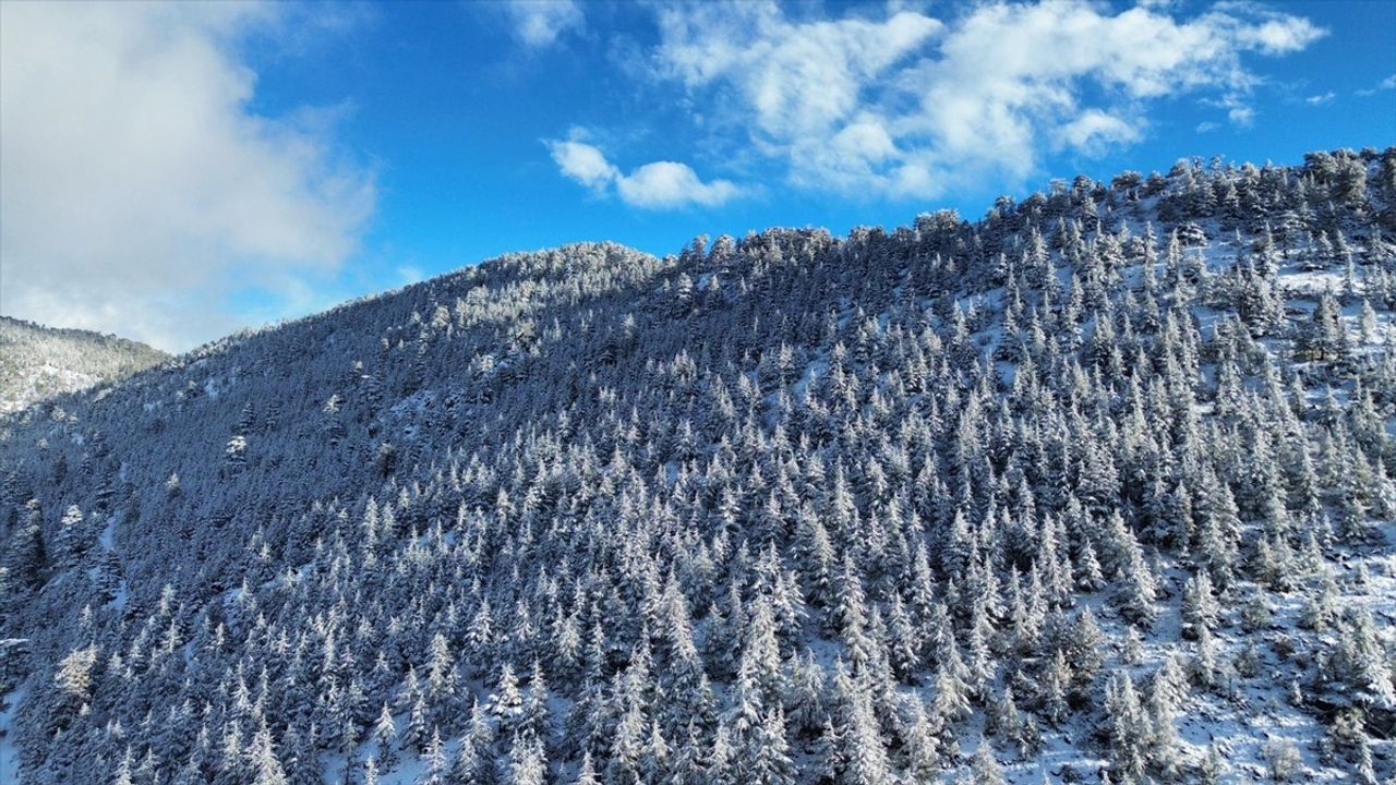 Antalya'nın Kaş ilçesinde karla kaplanan ormanlık alan, havadan görüntülendi.