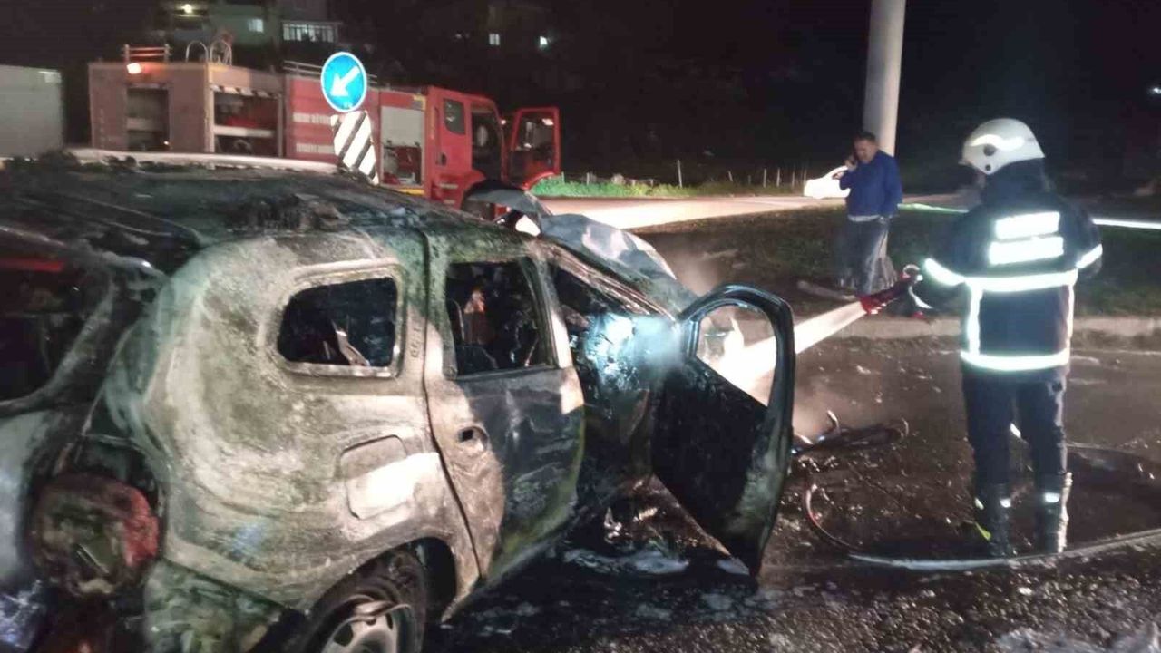 Hatay'da refüje çarparak alev alev yanan araç kullanılmaz hale geldi.