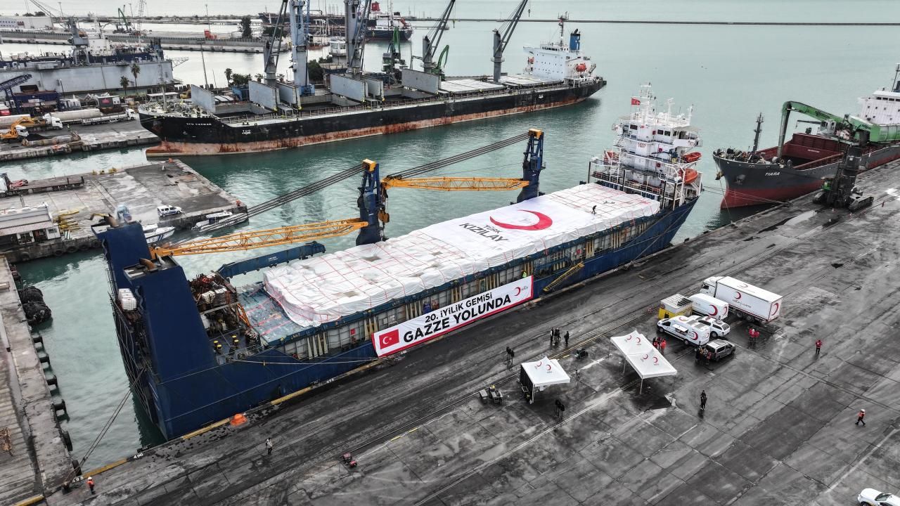 Türk Kızılay'ın Gazze'ye gönderilmek üzere hazırladığı, içerisinde yaklaşık 1400 ton insani yardım malzemesi bulunan 20. "İyilik Gemisi", Mersin Uluslararası Limanı'ndan uğurlandı.