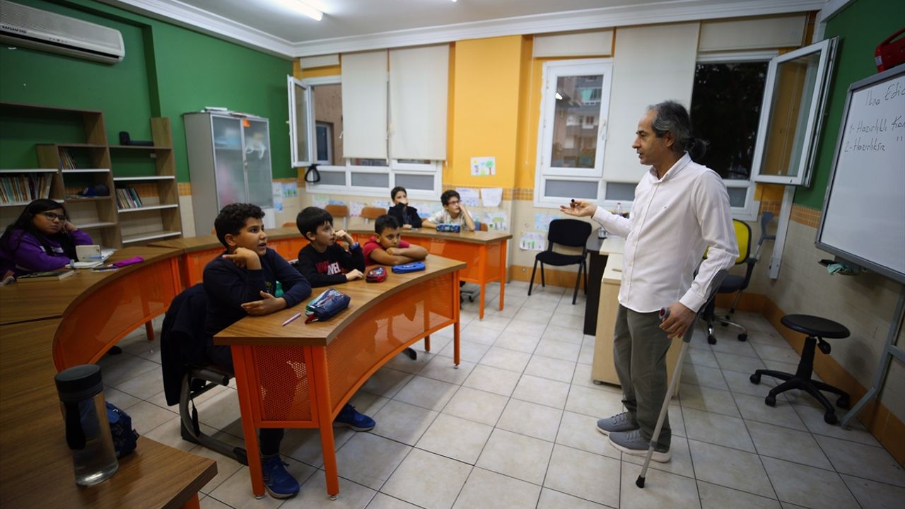 Adana'da özel yetenekli öğrencilerin eğitim aldığı okulda görev yapan 45 yaşındaki bedensel engelli Türkçe öğretmeni Mustafa Süt, koltuk değneğiyle verdiği derslerdeki azmiyle çocuklara örnek oluyor.