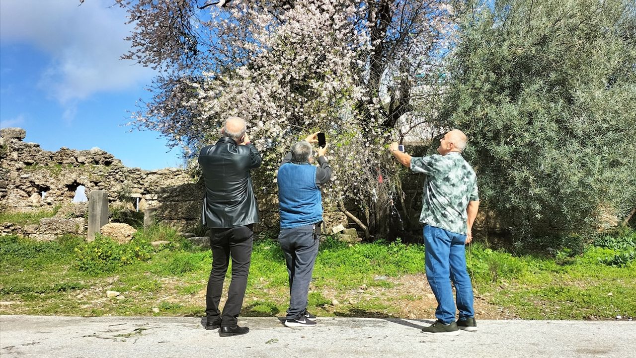 İlçede hava sıcaklığının mevsim normallerinin üzerinde seyretmesi nedeniyle antik kent ve çevresindeki badem ağaçları beyaz ve pembeye büründü.