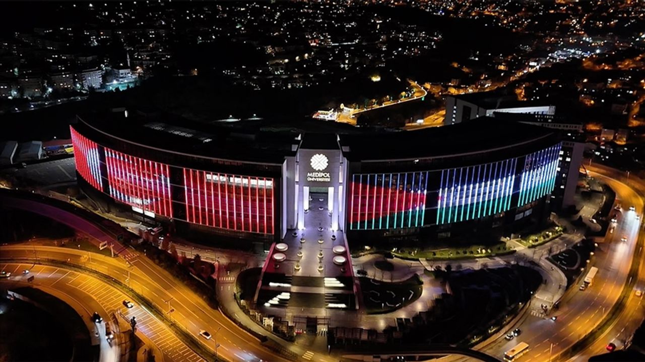Medipol Üniversitesi, kampüs binasındaki LED ekranda Filistin'e destek mesajları vererek İsrail'in Gazze'de uyguladığı soykırıma dikkati çekti.
