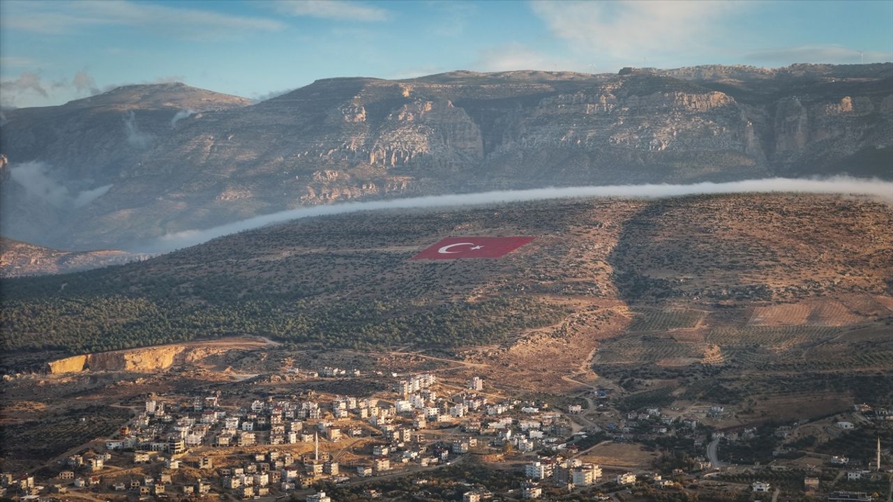 Sisin kapladığı dağlardaki 21 bin 600 metrekarelik Türk bayrağı sis altında dronla görüntülendi.