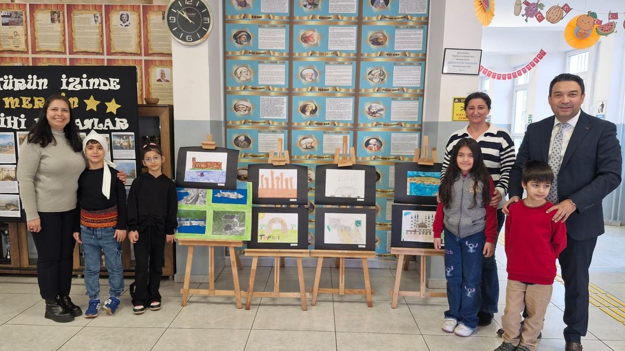 Mersin'in Yenişehir ilçesinde ilkokul öğrencileri, maketini yaptıkları tarihi mekanların resimlerini çizdi.
