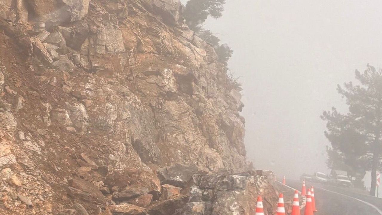 İlçede etkili olan sağanak nedeniyle Kaş Yaylası mevkisinde yola kaya parçaları düştü.