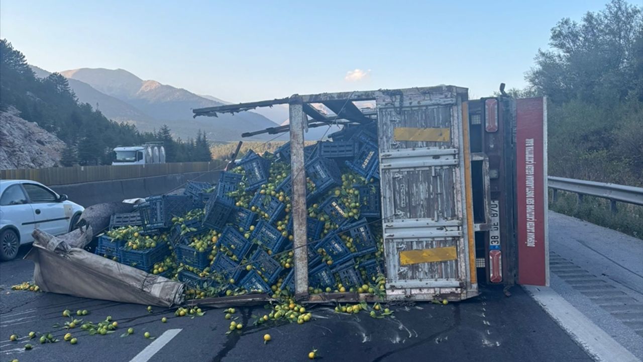 İsmi öğrenilemeyen sürücünün yaralanmadığı kazada, kamyondaki narenciye kasaları yola savruldu.