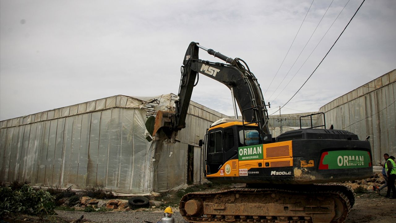 Ekipler, 34 bin 401 metrekarelik alana yayılan ev ve seraların yıkımına iş makineleriyle başladı.