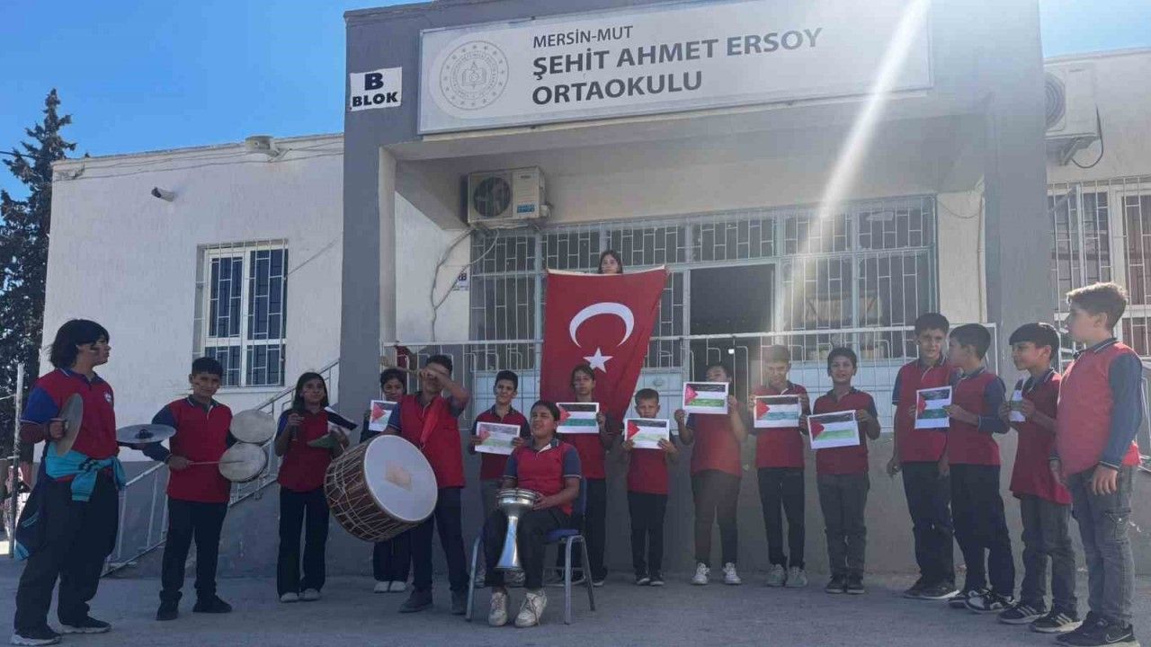 Mersin’in Mut ilçesinde ortaokulu öğrencileri, Filistin’e destek, Gazze’de yaşananlara dikkat çekmek amacıyla okul bahçesinde etkinlik yaptı.