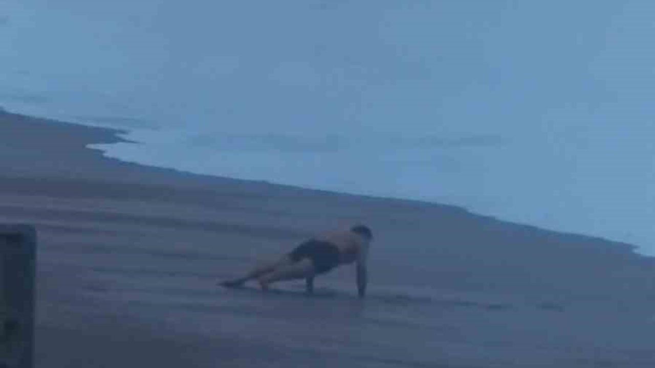 Antalya'da şiddetli rüzgar nedeniyle oluşan dev dalgalar sahili döverken, bir vatandaş dalgaların arasında şınav çekerek sabah sporu yaptı. O anlar başka bir vatandaşın cep telefonu kamerasına yansıdı.