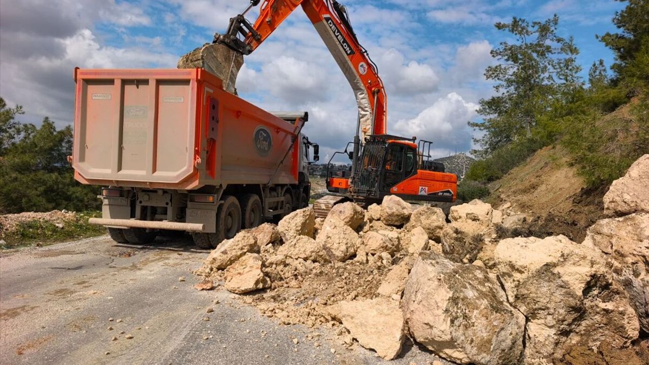 Kaya parçalarını iş makinesiyle kaldıran ekipler, yolda temizlik yaptı.